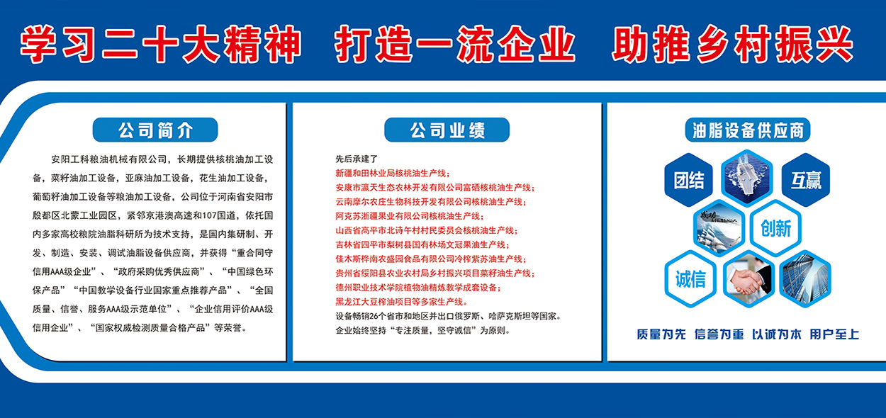 安陽工科糧油機械有限公司,長期提供核桃油加工設備,茶籽油加工設備,菜籽油加工設備,亞麻油加工設備,花生油加工設備,葡萄籽油加工設備等糧油加工設備,公司位于河南省安陽市殷都區(qū)北蒙工業(yè)園區(qū),緊鄰京港澳高速和107國道,依托國內多家高校糧院油脂科研所為技術支持,是國內集研制、開發(fā)、制造、安裝、調試油脂設備供應商,并獲得“重合同守信用AAA級企業(yè)”、“政府采購優(yōu)秀供應商”、“中國綠色環(huán)保產品”“中國教學設備行業(yè)國家重點推薦產品”、“全國質量、信譽、服務AAA級示范單位”、“企業(yè)信用評價AAA級信用企業(yè)”、“國家權威檢測質量合格產品”等榮譽。先后承建了新疆和田林業(yè)...